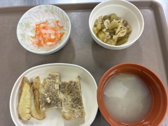 皆さん、こんにちは!! 本日も、とある日の献立について紹介します♫ 松風焼き、ふきの信田煮、 大根なます、味噌汁です😊 松風焼きとは、“裏側には何もない” →“何もない”=“松風(海辺で風が吹くと砂だけで…