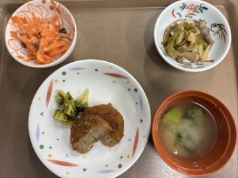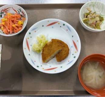 皆さん、こんにちは!! 本日も、とある日の献立について紹介します♫ メンチカツ、ピーマンのコンソメ炒め、 人参とレーズンのサラダ、味噌汁です😊 人参🥕とレーズンのサラダは、 人参の自然な甘…