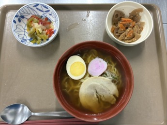皆さん、こんにちは!! 本日も、とある日の献立について紹介します♫ ラーメン、れんこんきんぴら、 ピーマンのナムルです😊 さくら膳🌸特製ラーメン🍜は、 大きいチャーシューが…